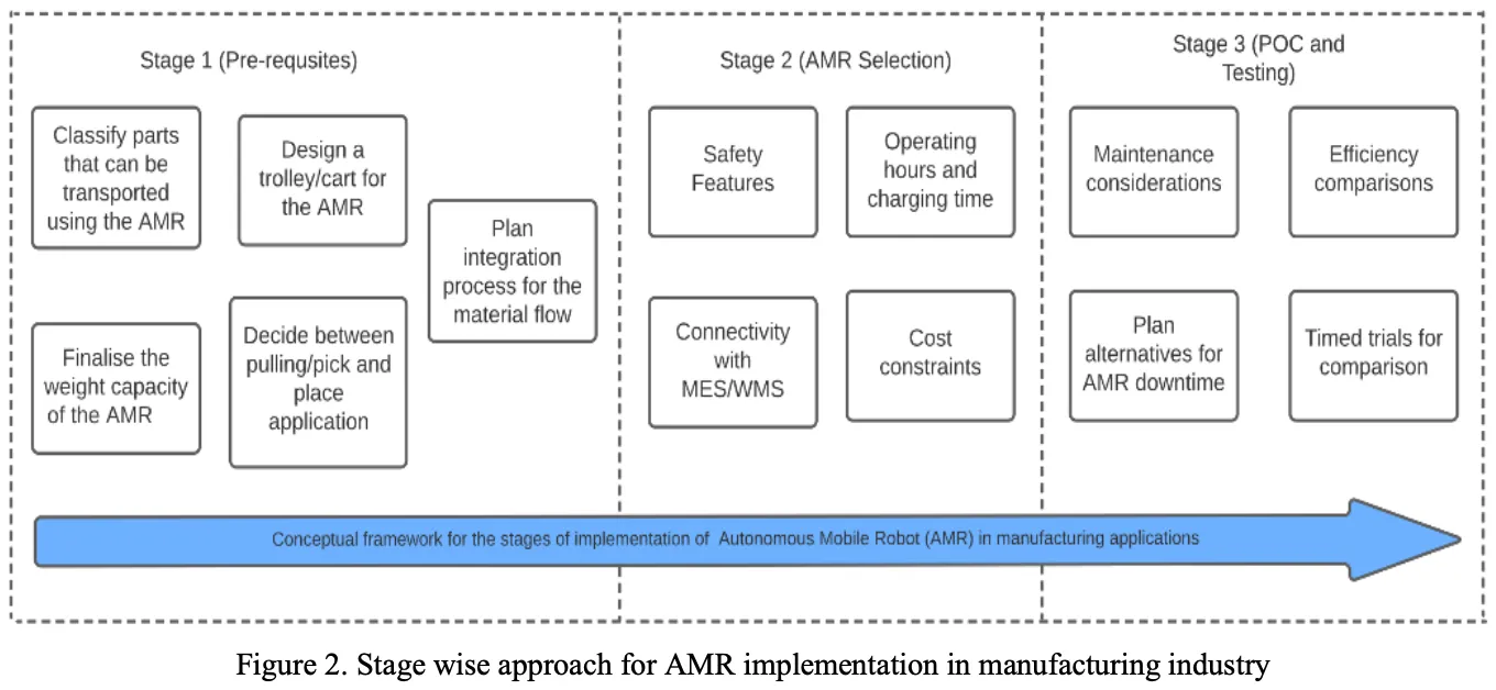 实施计划的第一步是根据AMR(如组件、子装配件、成品或生产过程中使用的其他物料)对需运输的物料进行分类。AMR能够执行设施内部的库存与产品运输,承担对产品或运营附加价值较低或无附加价值的低技能任务。它们可接收、分拣并将产品运送至指定位置,适用于输送机间的物料转运、拣选与发货操作中的产品排序,以及订单托盘化。AMR适用于动态环境及包含不同库存SKU的操作场景,也适用于“人到货”和“货到人”的物流操作。