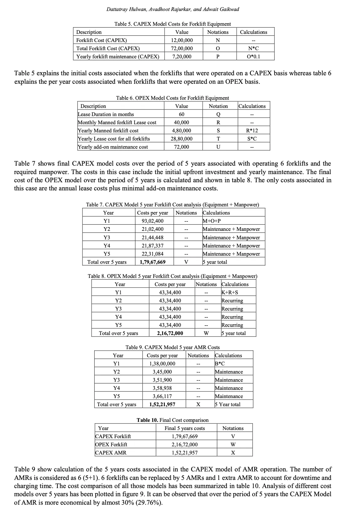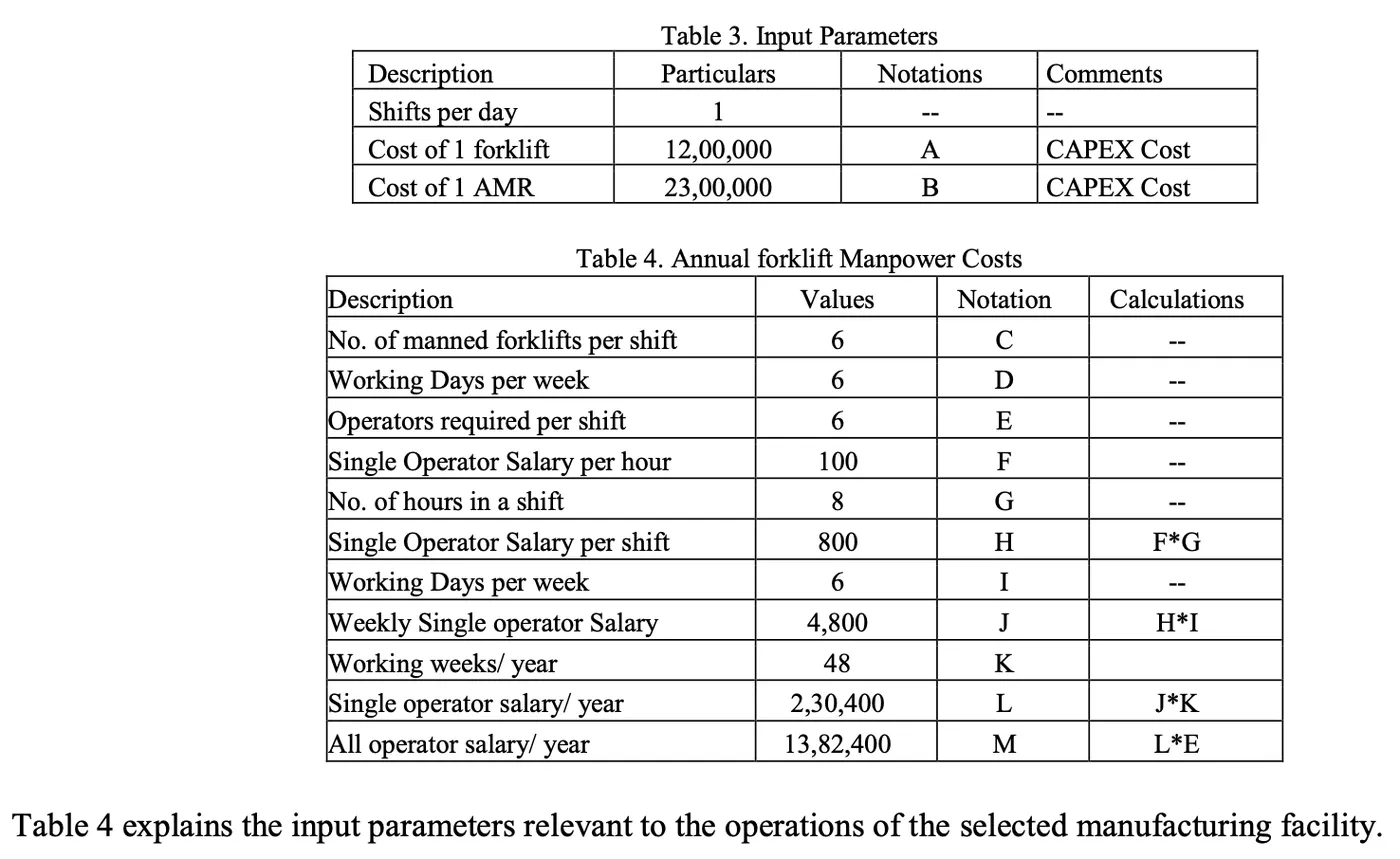 在实施此类系统时应实现的主要优势之一是其相关的成本效益。AMR的一个核心特点在于执行任务时所需的人工监督更少。一名工程师可同时控制多台AMR,从而实现成本效益与安全性并存。另一方面,每台拖车操作员均需配备一名人工驾驶员,进而增加相关成本。AMR的初期投资属于CAPEX,涉及购买或租赁机器人本体及相关基础设施(如充电站或导航系统)。此类支出将计入资产负债表并在机器人使用寿命内进行折旧。而AMR运行和维护的持续成本(包括电力、维护及任何必要的软件更新)则属于OPEX。尽管CAPEX反映了向自主系统转型的前期投入,但OPEX则涵盖了利用和维护这些机器人所产生的日常运营费用。通过仔细评估OPEX与CAPEX,企业可就采用AMR做出明智决策,在初始成本与潜在长期运营效率及成本节约之间取得平衡。表3列出了叉车与AMR成本分析的基本输入参数,即资本支出部分 。