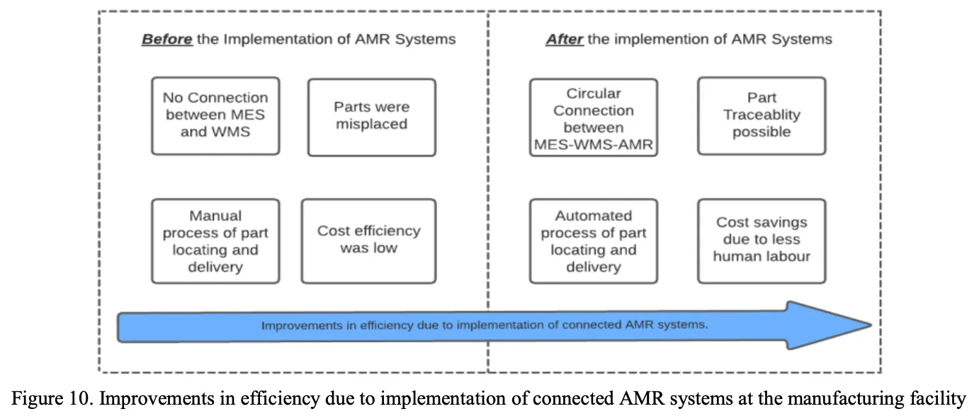 上述结果是通过对拖车与AMR在物料搬运方面的移动研究进行详细比较而得出的。通过速度、定时测试等多种因素计算物料搬运所需时间。本研究论文通过分析制造业实施I4.0相关的机遇与挑战,为持续探讨I4.0及其对制造业转型的潜力贡献了实践洞见,并提供了可帮助企业利用数字化力量实现效率与创新新高度的实用见解。本文综合考虑了制造企业在实施过程中可能面临的障碍,并提出了相应的解决方案与实施路径。研究识别了企业在I4.0实践应用中的研究空白,强调了对I4.0实际实施细节提供明确指导的必要性。文中讨论的实施阶段将帮助组织做出科学决策,提升其适应制造业快速变革与技术进步的能力。作为I4.0实施的一部分,AMR系统的实施优势已在图10中对比总结。