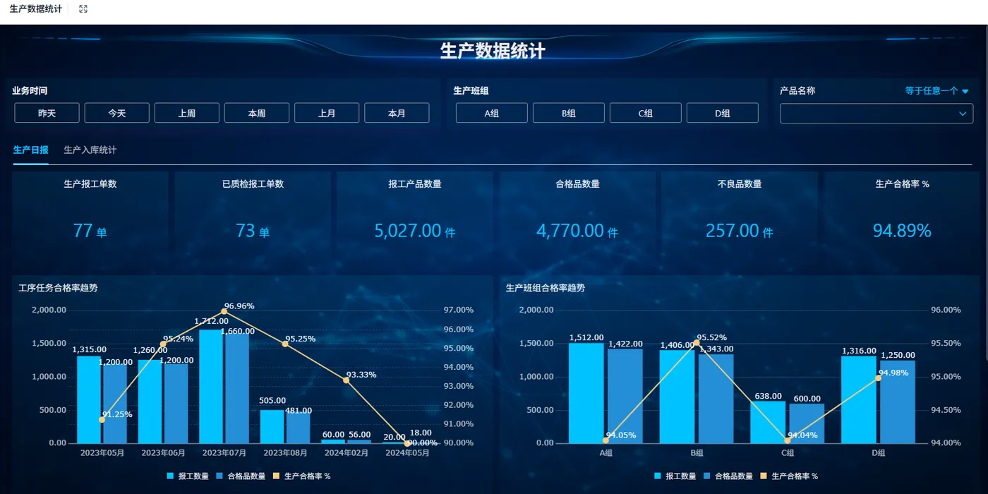 生产数据统计聚焦于生产过程中各类数据的汇总与分析。主要包括产量、耗时、物料消耗等数据的统计,能够帮助企业分析生产过程中的效率、物料利用率等关键指标。