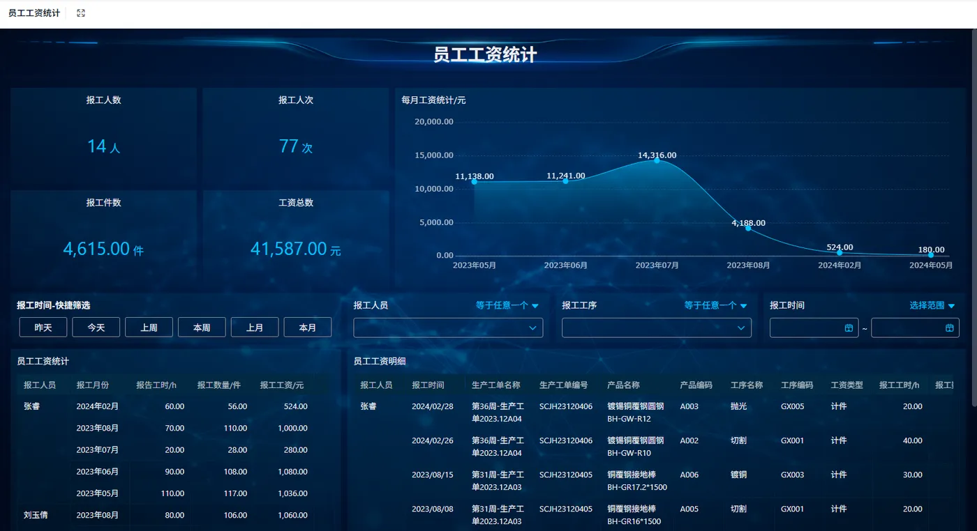 员工工资统计功能专注于员工的工资相关数据,通常包括工时统计、绩效分析、薪资构成等。通过这个模块,可以高效地进行员工薪酬计算和调整。