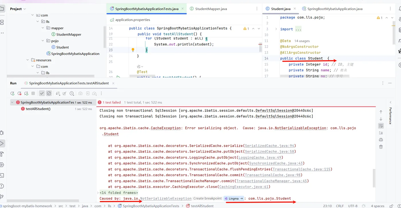 最后我们来测试一下实体类如果没有实现Serializable接口会怎么样?会不会导致序列化异常?