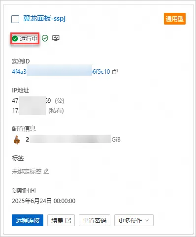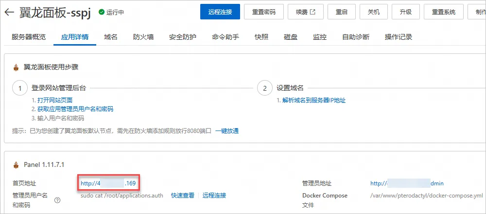 支付完成后,单击进入管理控制台。在服务器卡片列表找到已创建的轻量应用服务器。当轻量应用服务器状态从准备中变更为运行中后,表示翼龙面板已搭建完成。