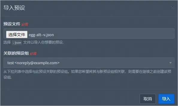 b. 在弹出的导入预设对话框中,选择预设文件和关联的预设组后,单击导入。
