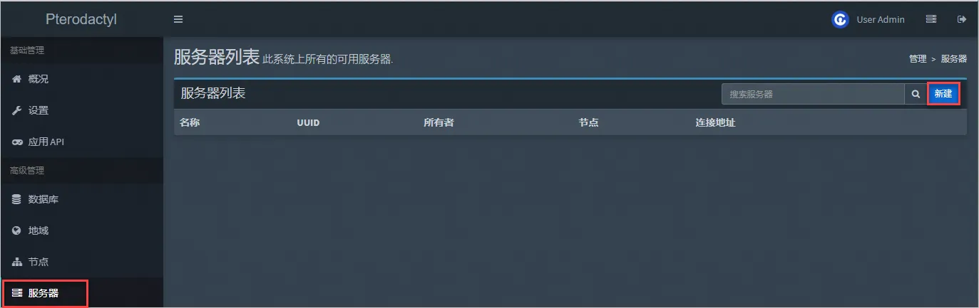 - 在服务器列表页面,单击新建。