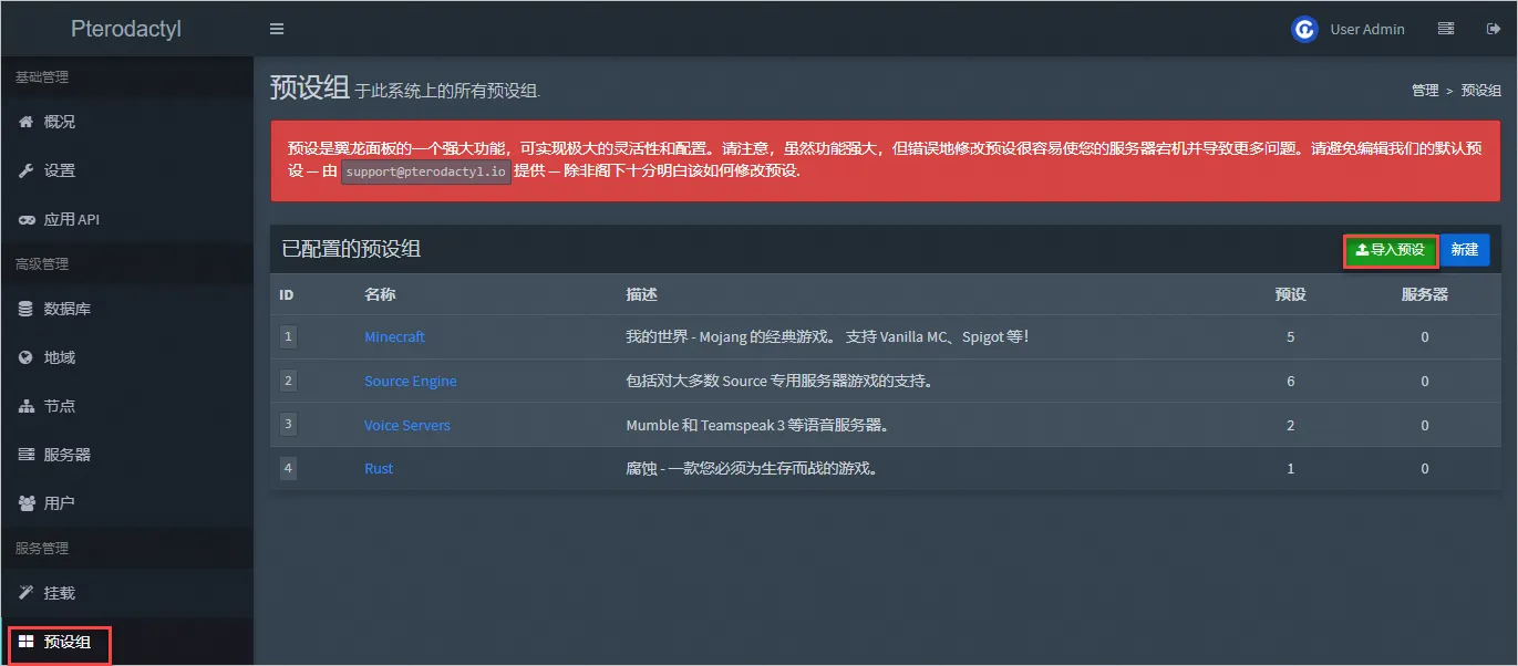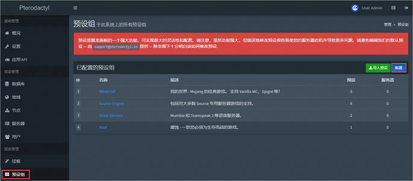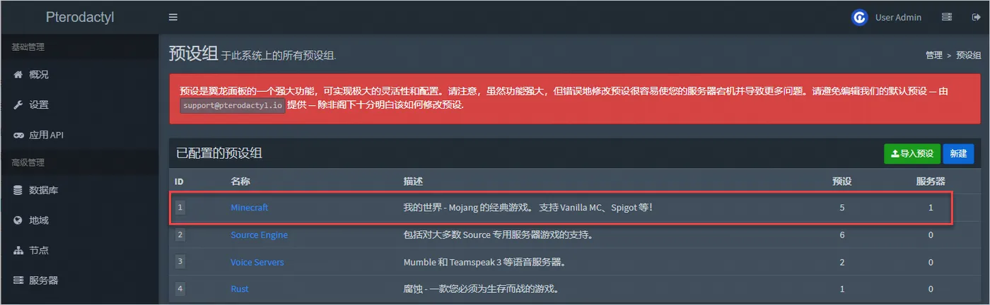 翼龙面板默认已经配置了4个预设组,并在预设组中导入了预设。本示例以搭建我的世界游戏服务器为例,使用默认预设组Minecraft,您无需新建预设组并导入预设。