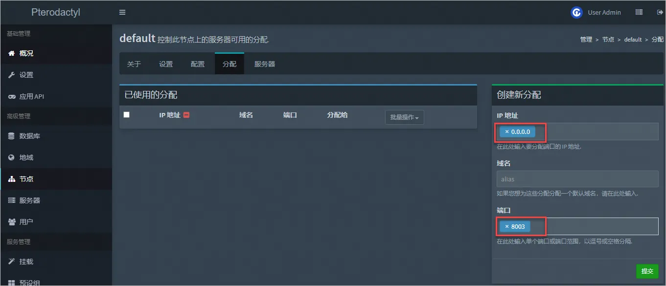 c. 单击分配页签,配置IP地址(0.0.0.0)和端口(示例为8003)后,单击提交。