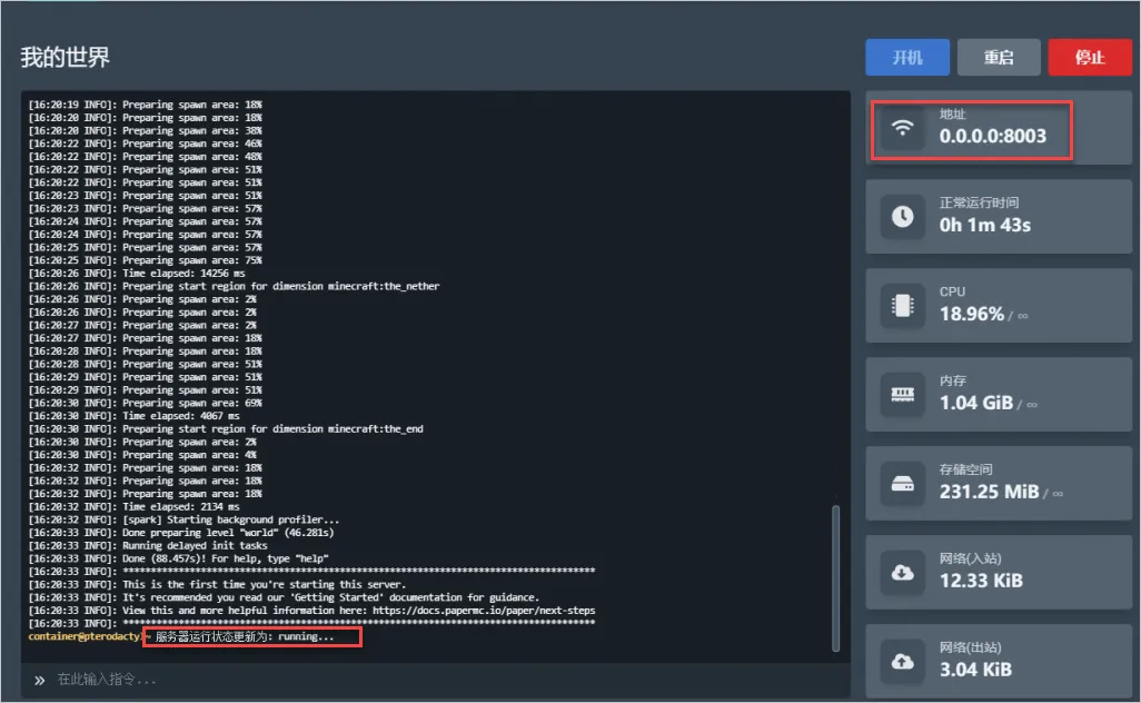当状态为running时,表示游戏服务器已经创建成功。在右上角的地址区域获取游戏服务器的服务器地址0.0.0.0:8003,并将0.0.0.0替换为节点所在轻量应用服务器的公网IP地址即可。