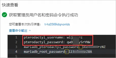 c. 在弹出的快速查看对话框中,获取管理员用户名和密码。将查询到的翼龙面板用户名以及密码信息保存至本地,便于后续登录翼龙面板。