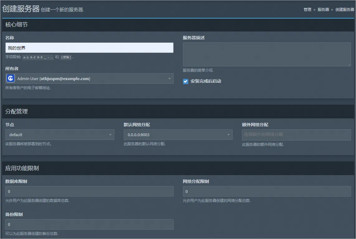 - 所有者:输入电子邮箱地址,翼龙面板默认创建了一个电子邮箱地址
