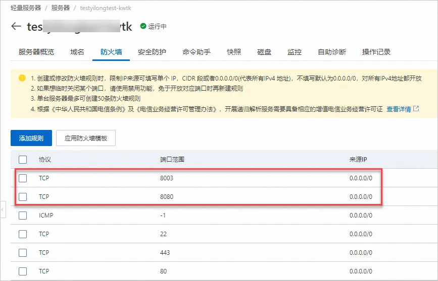 d. 在防火墙放行Wings守护进程8080端口和自定义分配的端口(本示例为8003)。具体操作,请参见防火墙设置。