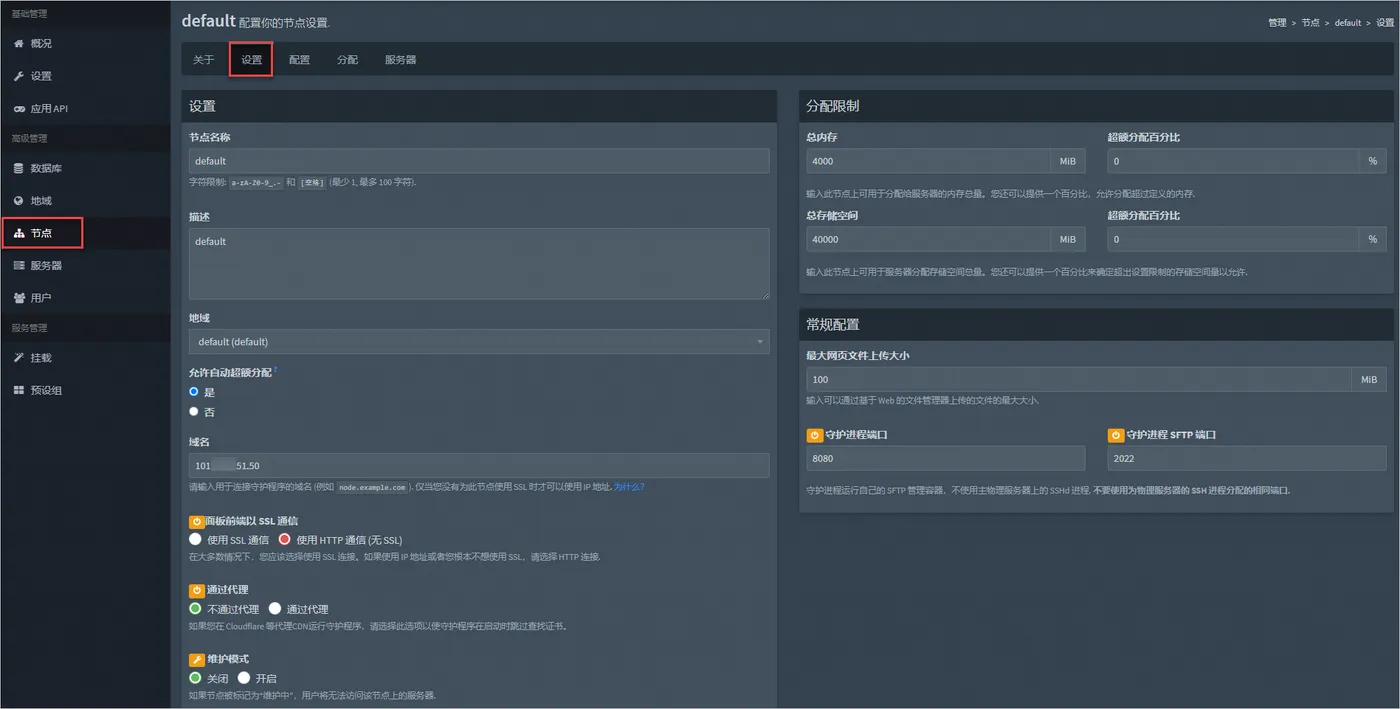 该节点默认配置总内存为4000 MiB,总存储空间为40000 MiB,您可以根据轻量应用服务器的内存和磁盘信息配置。关于新建节点的配置说明消息,请参见翼龙面板官网文档。