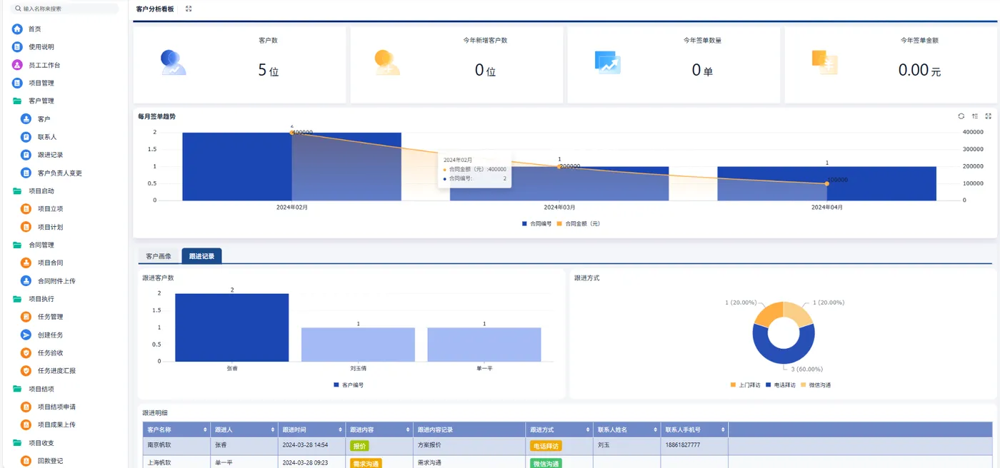 - 仪表盘:关键指标一览(已立项/进行中/已完成项目数、进度分布、风险数)