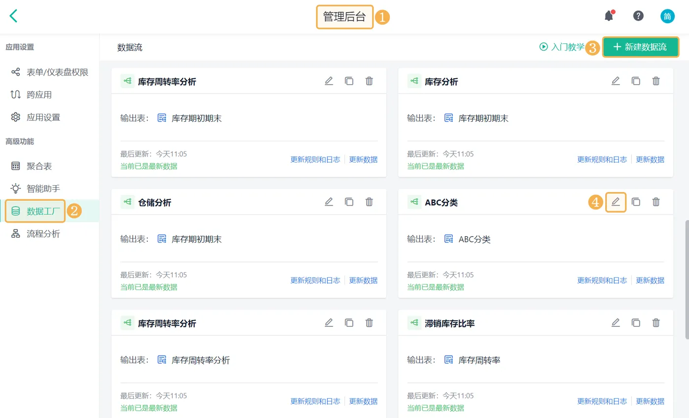 进销存系统可以直接用数据工厂 + 字段公式 + 数据更新周期任务自动维护。