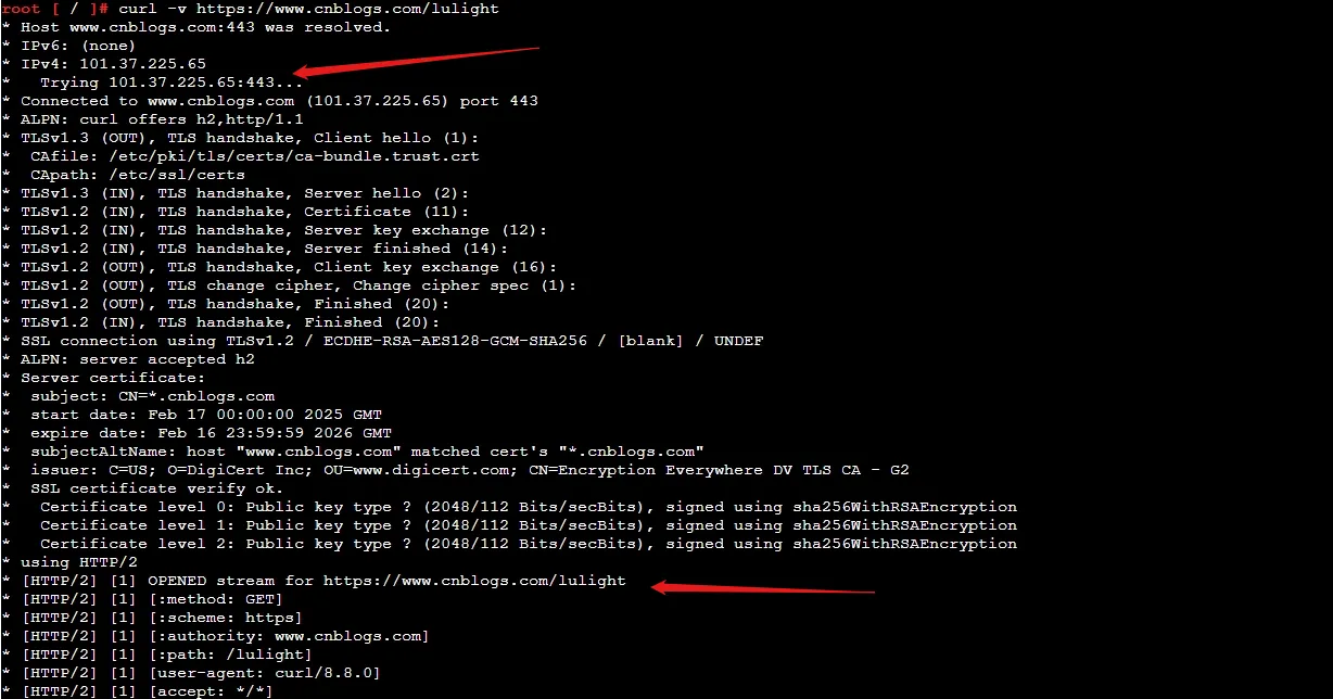 第三步:使用curl -v <目标URL> 来查看是否可以发出请求