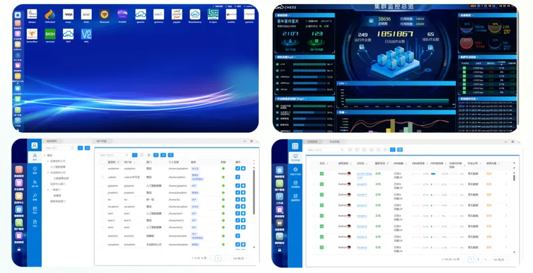 - 管理员端功能模块——保障集群高效、稳定、安全运行的“基石”:通过统一的集群管理门户界面,管理员可以快速配置系统、分配用户权限、全面监控资源、及时排查故障、有效掌控全局,方便地进行整套集群资源、作业、用户的管理和监控。