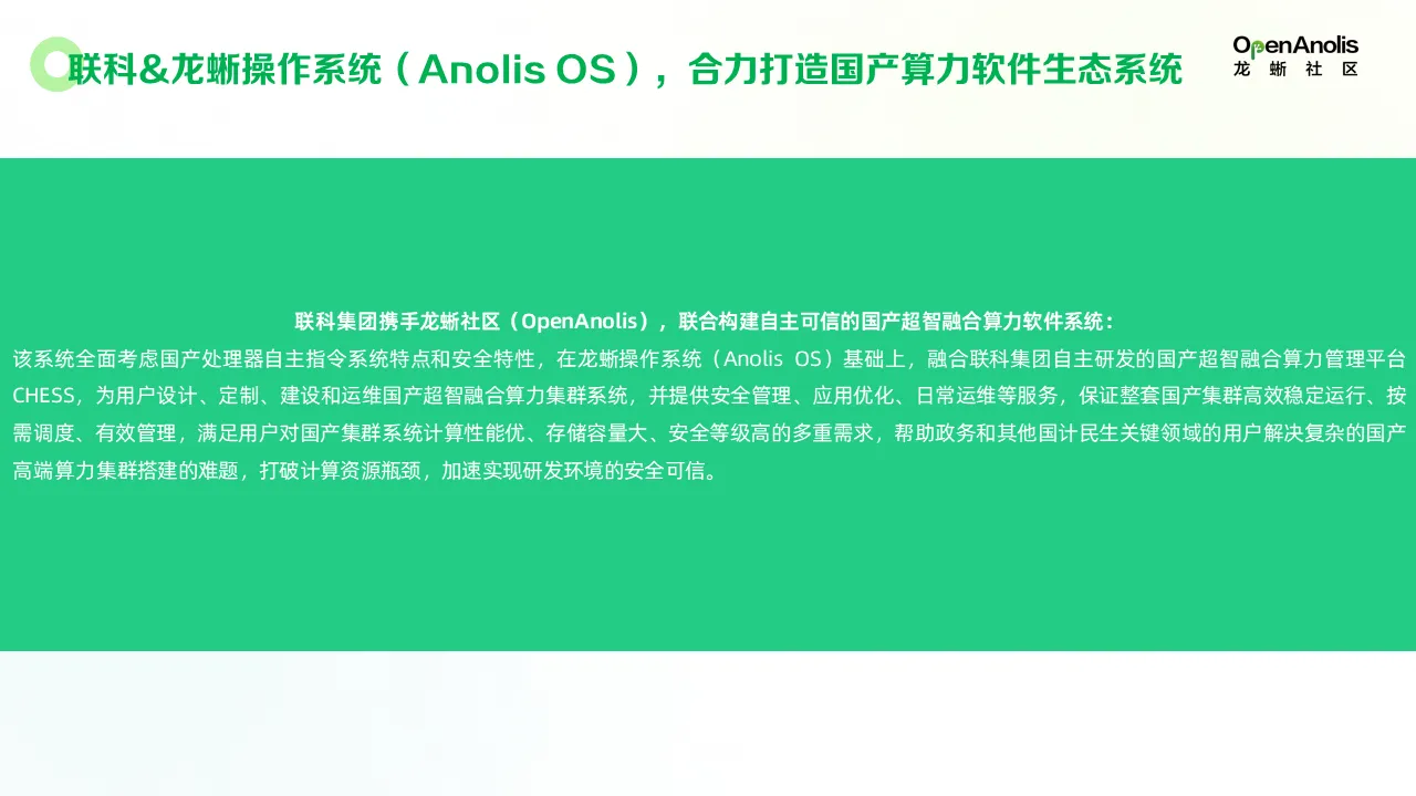联科集团加入龙蜥社区多年,与龙蜥保持深度合作,完成超智融合算力管理平台 CHESS 与 Anolis OS 的兼容性认证,实现: