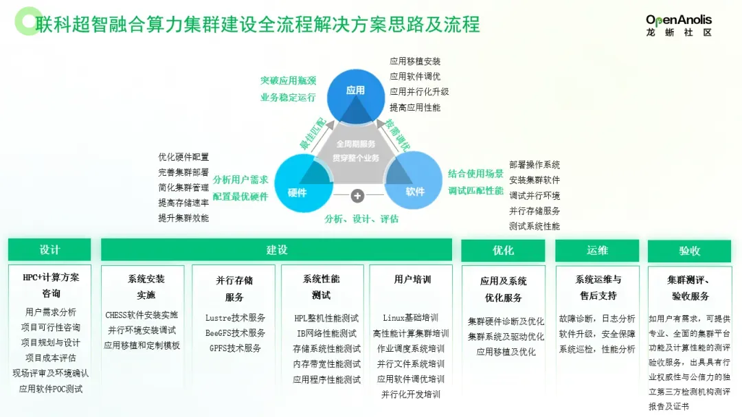 在集群建设阶段,联科集团提供全面的集群建设服务,包括硬件部署、操作系统部署、集群软件安装、应用集成及优化等。通过专业的技术团队和丰富的建设经验,确保集群的搭建过程高效、稳定、可靠。