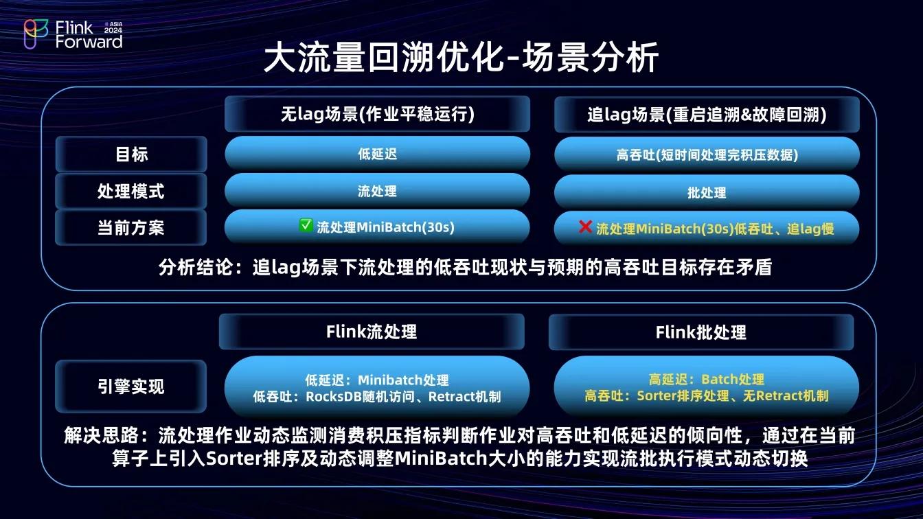 无 lag 场景追求低延迟,数据实时产出,期望数据处理模式为流处理;追 lag 场景追求短时间内快速恢复,数据高吞吐,期望处理模式为批处理。