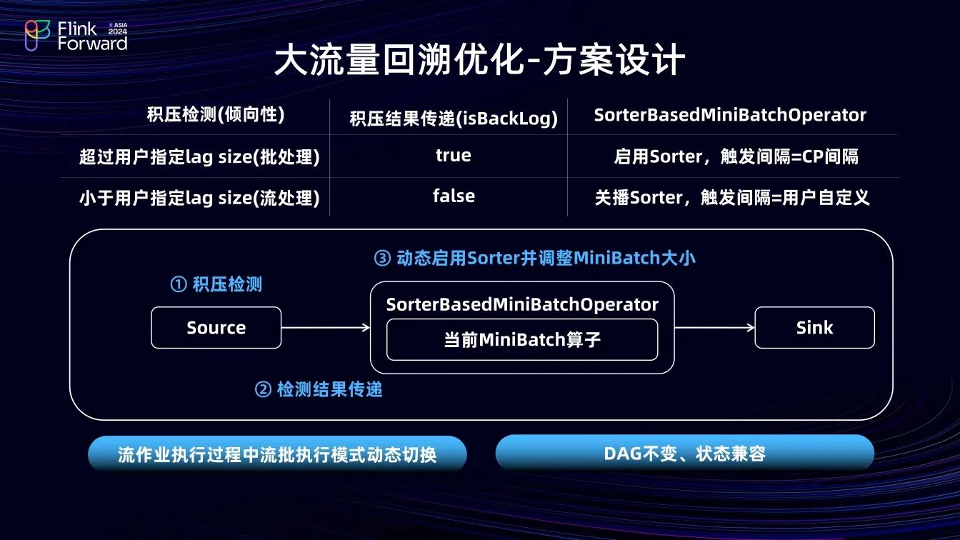 该方案核心步骤包括积压检测、检测结果传递和动态启用 sorter 算子并调整 Minibatch 大小。Flink 作业运行时,Source 算子动态监测 lag size;当 lag size 超过指定值时,向下游算子发送数据时,标记 isBackLog 为 true,聚合算子接收数据后解析该字段,若为 true,则认为当前作业倾向于批处理,启用 sorter,将 Minibatch 的大小间隔调整为 CP 的间隔。