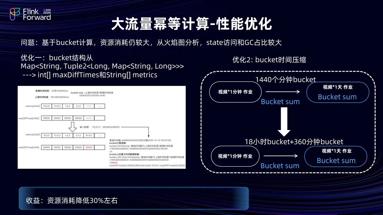 其一,优化 Bucket 结构,将多层嵌套结构改为两个数组,两个数组的长度等于 Bucket 的长度,无需要存储 Bucket key,按照数组的顺序取对应 Bucket。一个数组存储时间戳位移,将 long 格式的时间戳存储为 int 类型(减少存储占用),另一个数组通过字符串拼接指标值,将原本的 Map 中指标的 value 拼接成一行,节省 state 中的空间占用。