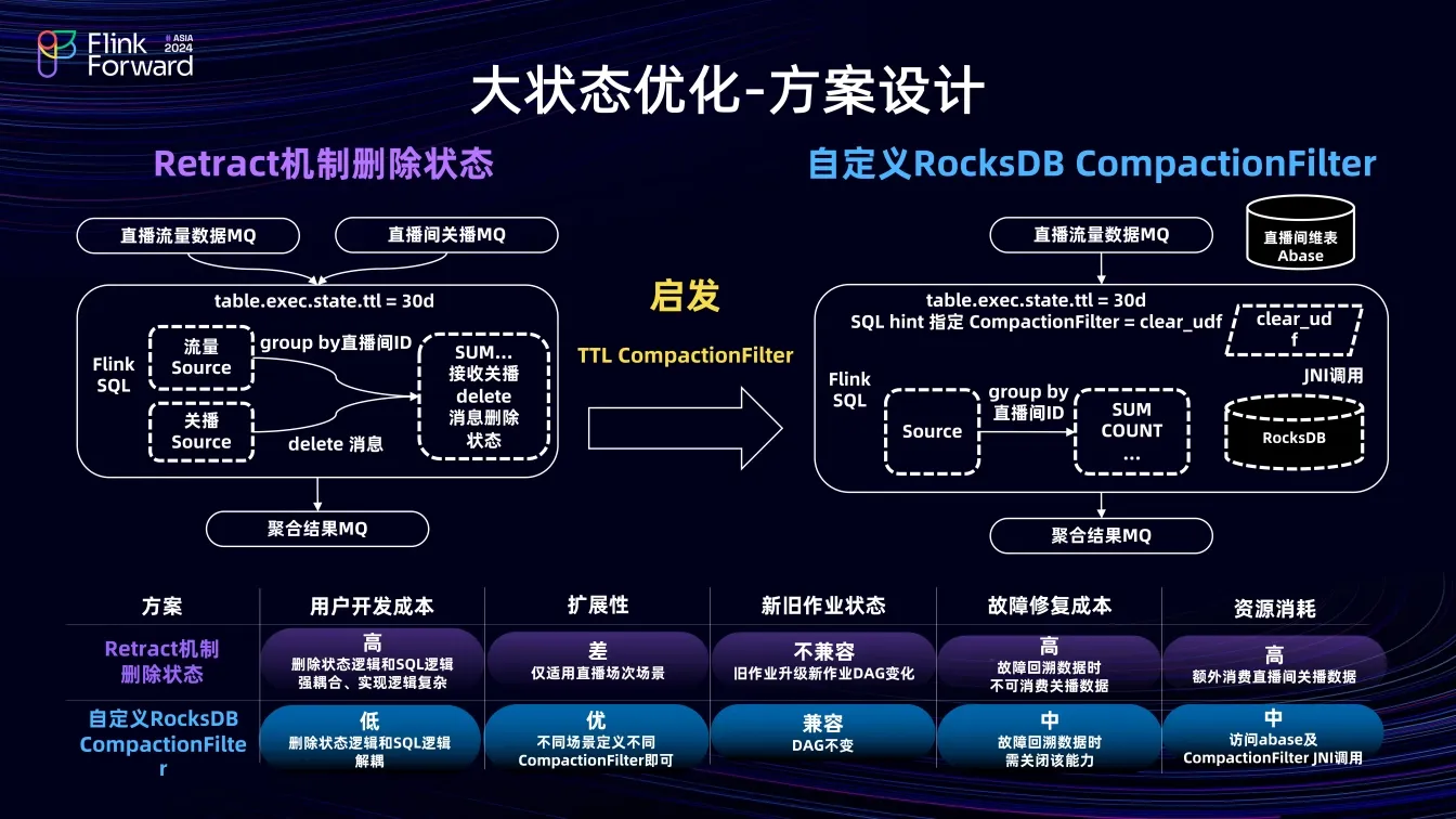 总结问题后,发现其核心是删除状态逻辑与 SQL 逻辑强耦合,进而设计了第二种方案作为TTL CompactionFilter 方案的扩展,即自定义 RocksDB CompactionFilter 方案。两者执行时机相同,自定义 RocksDB CompactionFilter 方案支持通过 Java UDF 为指定状态设定CompactionFilter 。两者的区别在于,TTL CompactionFilter 执行时解析状态中的时间戳判断状态是否删除,而自定义方案在 RocksDB 执行时,通过JNI将状态数据传给 Flink TM,解析直播间 ID 作为 CompactionFilter 入参,访问直播间 Abase 维表,判断是否关播,若关播,则 CompactionFilter 返回 true,删除状态。此方案实现了直播间关播后的状态删除,且与 SQL 逻辑完全解耦,解决了方案一中的问题。