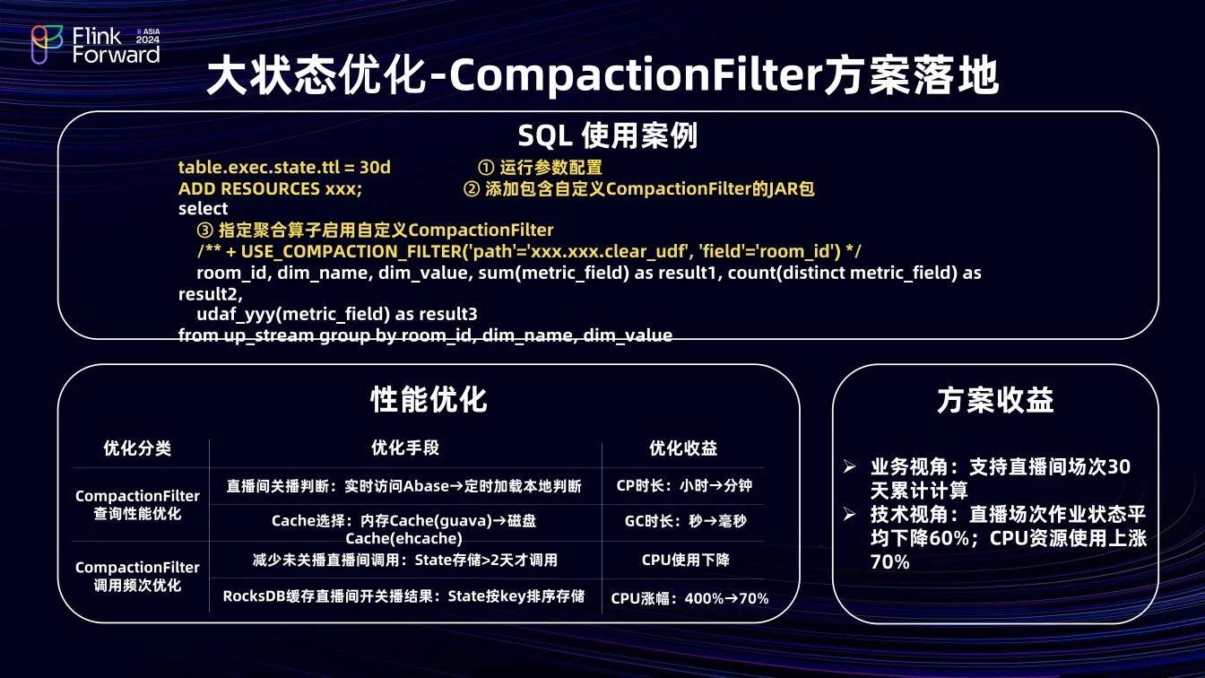 实现过程中对性能问题进行了优化,如 CompactionFilter 查询性能优化,将实时访问 Abase 优化为批量加载关播直播间数据到本地,判断是否关播,避免Compaction 执行过程中, CompactionFilter 访问外部组件查询阻塞,减少 CP 的时长;Cache选择优化,将本地存储关播直播间的 cache 从内存优化到磁盘,降低 GC 时长;CompactionFilter 调用频次优化,设定 state 存储时长超过两天才调用 CompactionFilter,减少未关播直播间频繁调用导致的 CPU 浪费,同时在 RocksDB C++侧缓存 直播间开关播的结果(CompactionFilter 结果),利用 RocksDB 存储机制,将直播间 ID 放在 group by 语句最前面,顺序存储相同 ID 的状态数据,复用 CompactionFilter 调用结果,避免 JNI 调用带来的性能损耗。