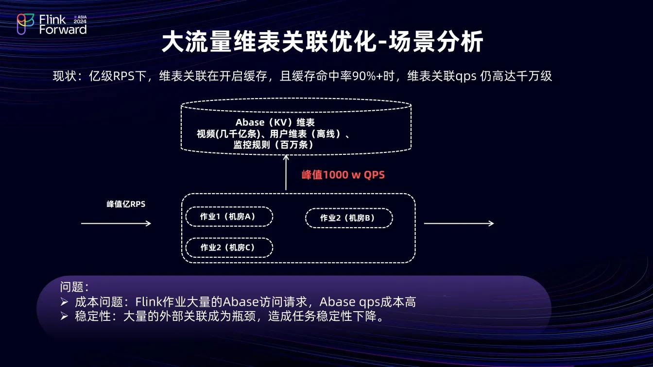 高 QPS 的维表访问导致 Abase 集群压力大,Flink 任务稳定性差,关联维表成为瓶颈。虽提升维表关联缓存命中率可降低外部请求 QPS,但目前缓存命中率已达 90% 以上,提升空间有限。且并非所有维表都超大且时效性要求高,如离线用户维表和百万级监控规则表都相对较小。数仓大量使用 Abase 这种 KV 存储支持大访问 QPS,但当超出其承受能力时,会带来不可控,因此需摆脱对 KV 引擎的依赖,引入新的维表存储方式。