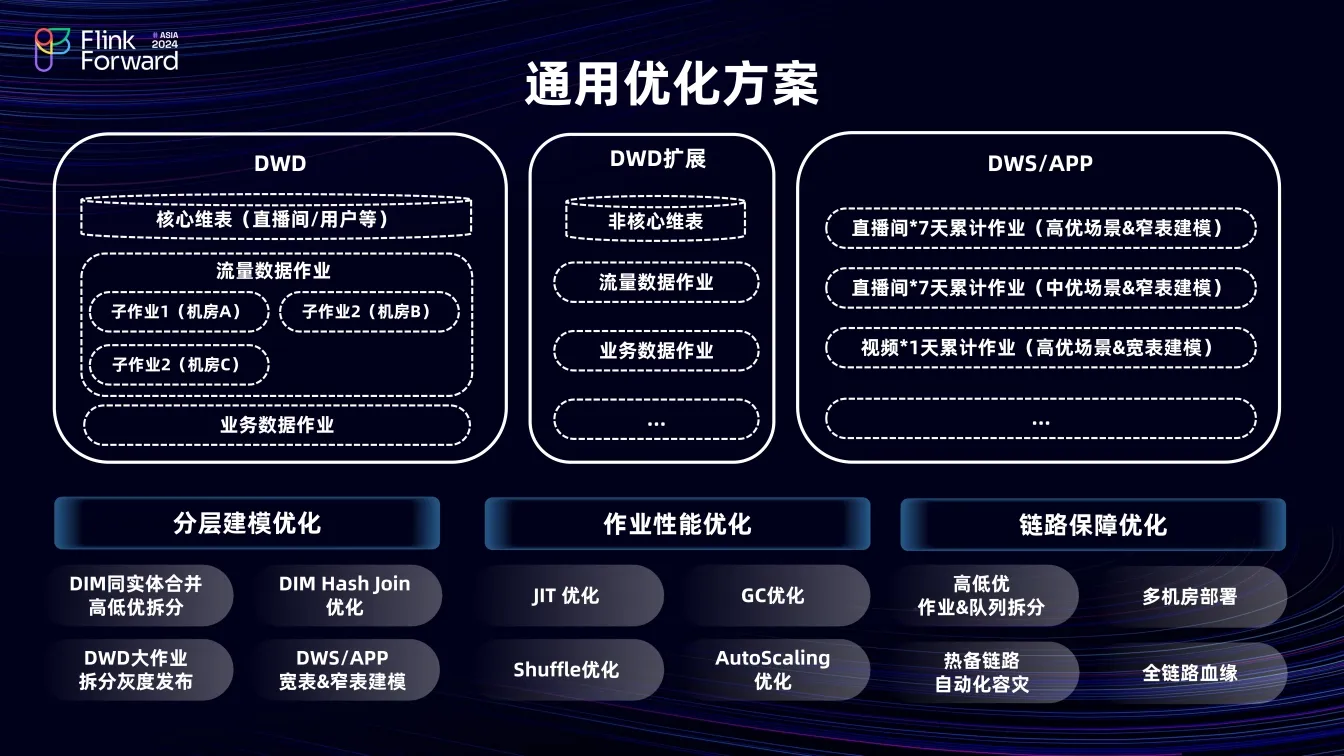 在分层建模时,将相同实体、不同维度的数据合并为一张维表,以降低下游消费RPS。在维度关联时,使用 Keyby 提升本地缓存命中率。对于 DWD 大作业,将其拆分成多个小任务灰度上线。在视频大流量场景下,采用宽表模型输出指标,即将所有数据置于一行,存储在一个 Map 中输出;直播场景则使用窄表 Anchor 模型,一条数据对应一个指标一行数据。这两种模型在新增指标时均可实现状态兼容。