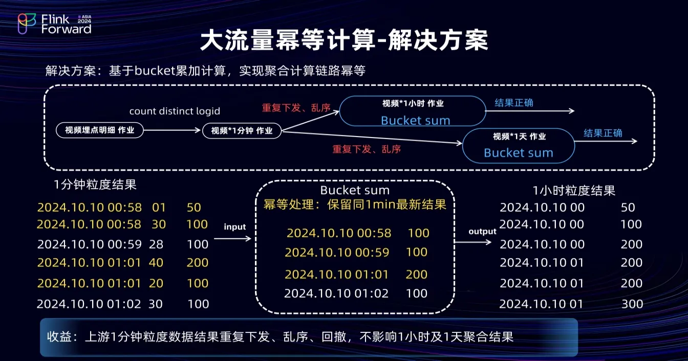 在大流量聚合计算优化方面,由于数据量大,短视频的小时和天级指标从分钟中间层聚合,这会导致分钟聚合输出有重复数据、乱序数据甚至回撤数据。如果直接通过先取 max 等方式聚合,其计算成本高且会引入回撤流问题,导致原本递增的埋点指标下降。以分钟向小时聚合为例,小时任务需要每一分钟的最后一条数据。