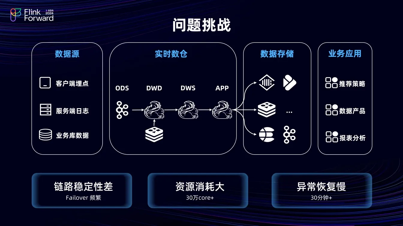 在 DWD 明细层,关联大量维表时面临巨大压力。大流量场景下整体流量达亿级规模,无法直接请求维表,即便开启维表 LRU cache 请求量也达千万级,这带来了成本和稳定性难题。在指标聚合计算时,大流量下解决重复数据问题挑战巨大。