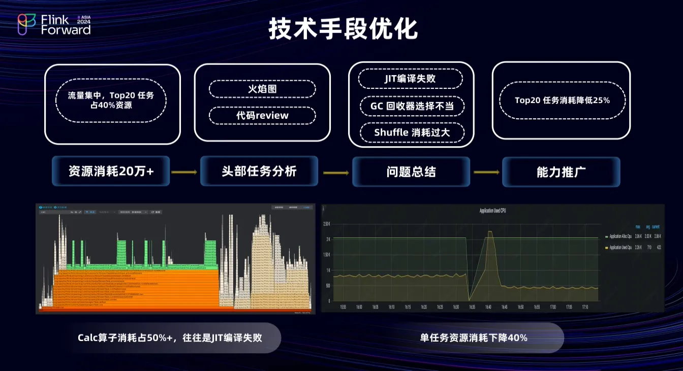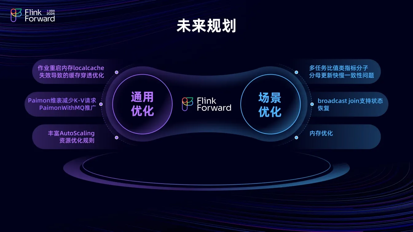作业重启时内存 localcache 失效导致的缓存穿透优化;使用 Paimon 维表能力减少对 Redis 等 K-V 存储的请求,使用 PaimonWithMQ 能力减少 MQ dump 派作业,节约资源;丰富 AutoScaling 的资源优化规则,获取更多收益。
