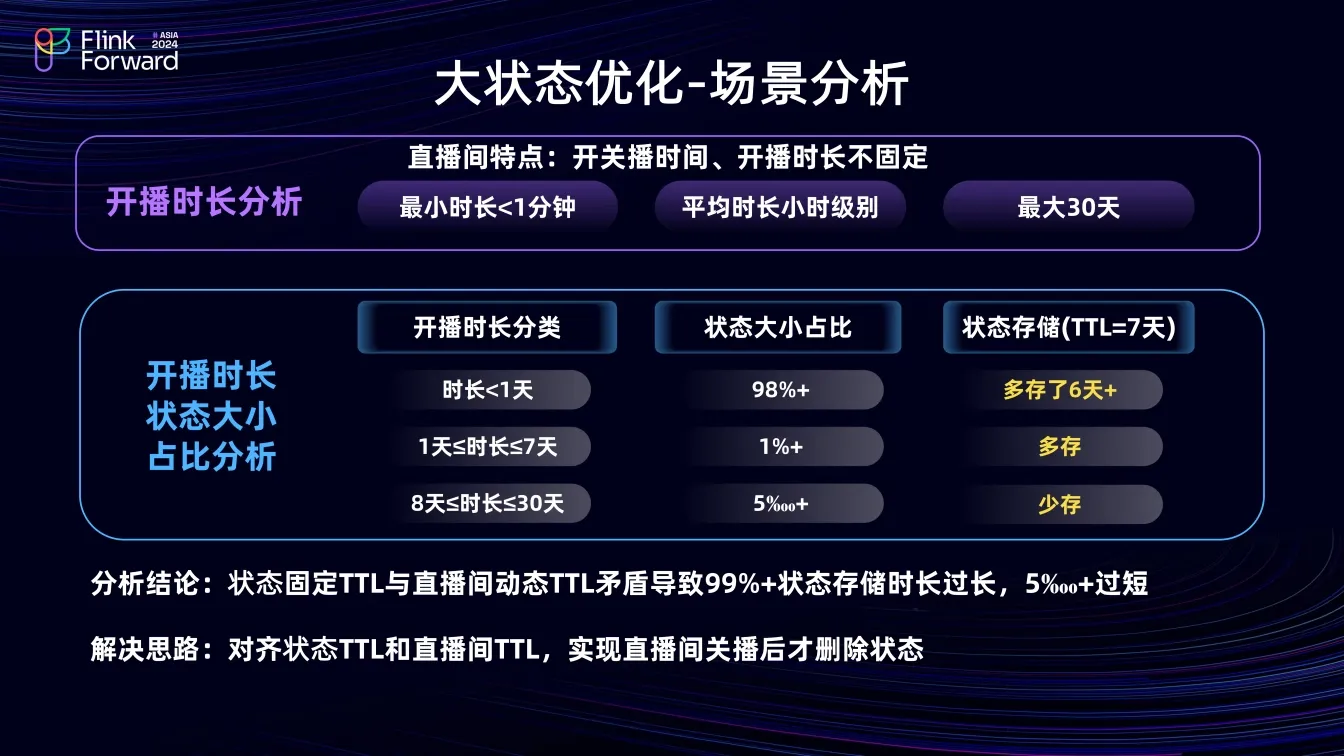 对于大状态优化场景,直播间开关播时间和时长不固定,最短不到分钟级,最长 30 天,平均在小时级别。分析 Flink 作业中不同开播时长的状态大小占比发现,state TTL 为七天时,开播时长一天的直播间状态大小占98%,这部分多存储六天;大于一天小于七天的占 1%,也存在多存情况;大于八天的仅占 0.5‰,存在少存情况。该问题的核心是状态固定的 TTL 与直播间动态的 TTL 矛盾,导致 99% 的状态多存,0.5‰状态少存。