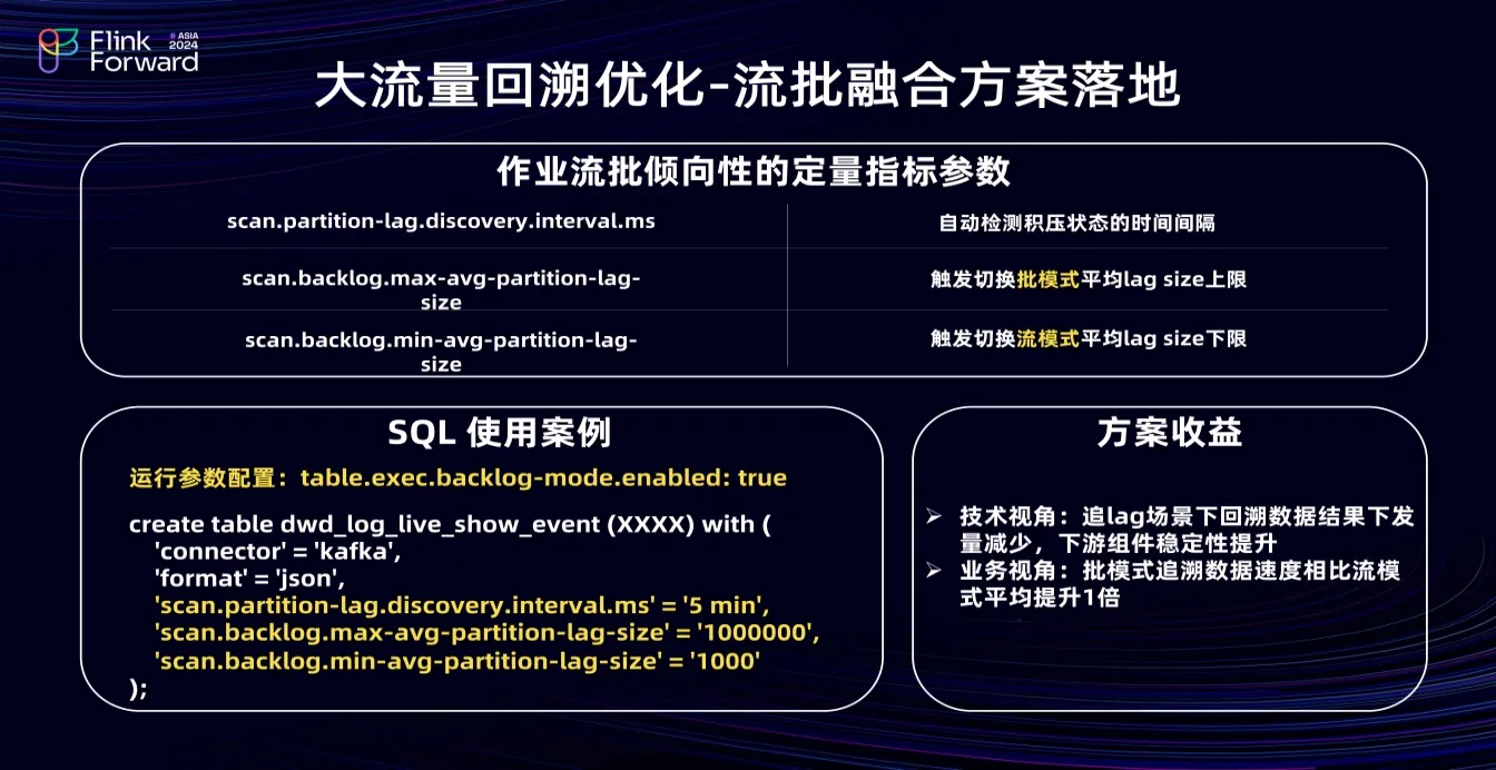 Flink流批倾向性指标有三个,即自动检测积压状态时间间隔、触发切换批模式处理的平均 lag size 上限、触发切换流处理平均 lag size 下限。SQL 使用案例如上图左下角所示:首先,在运行参数中设置 backlog mode开启,然后在 source 算子中指定以上三个参数,进而实现 Flink作业流批融合的处理。