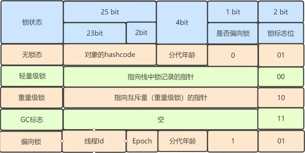| 指向栈中锁记录的指针 | 00 | 轻量级锁定 |