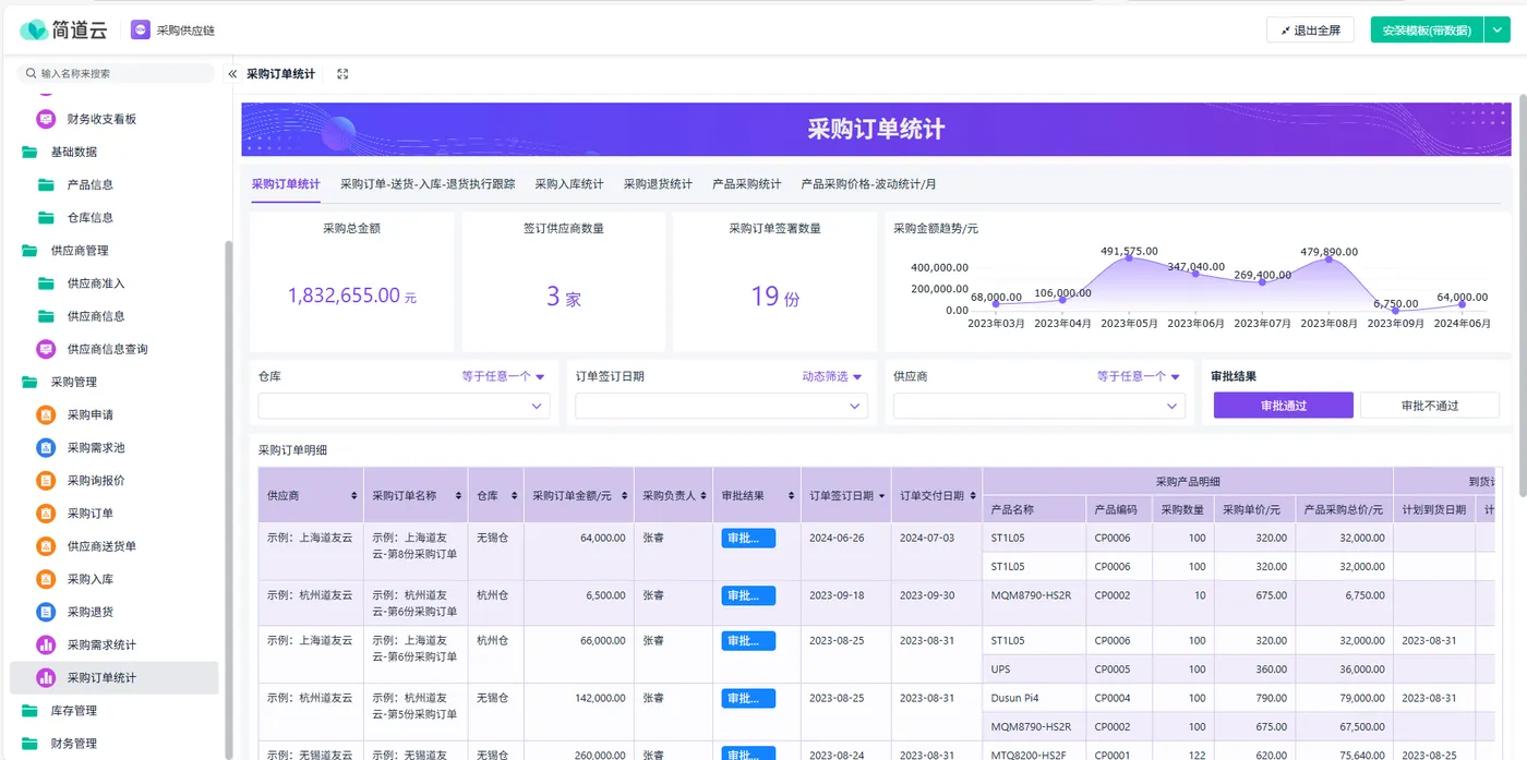 采购管理模块的核心是对供应商、采购订单、库存管理的全面监控。通过与供应商进行协作,企业可以实现更精准的采购预测,降低库存压力,避免采购过剩。