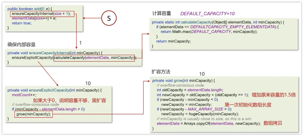 第二:计算数组的容量,如果当前数组已使用长度+1后的大于当前的数组长度,则调用grow方法扩容(原来的1.5倍)
