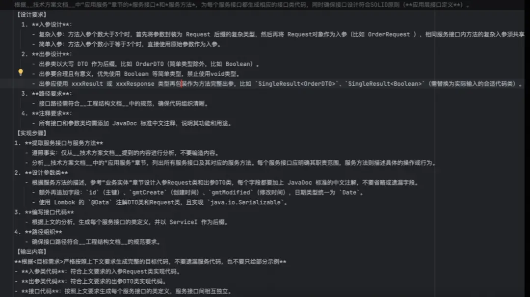 - 代码设计阶段:至于说一个功能拆几个函数实现,用什么类库之类的可以让AI自由发挥,我们要做的是确保AI产出的代码符合我们的代码设计的规范及要求。