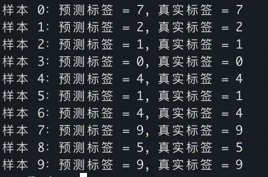 # 进行预测 predictions = model.predict(test_images) # 找出每个样本中概率最大的元素所在的索引,也就是预测的类别 predicted_labels = np.argmax(predictions, axis=1) # 打印前 10 个样本的预测结果和真实标签 for i in range(10): print(f"样本 {i}:预测标签 = {predicted_labels[i]}, 真实标签 = {test_labels[i]}")