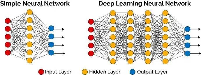 图中展示了简单神经网络和深度神经网络,其中包含三个关键元素: