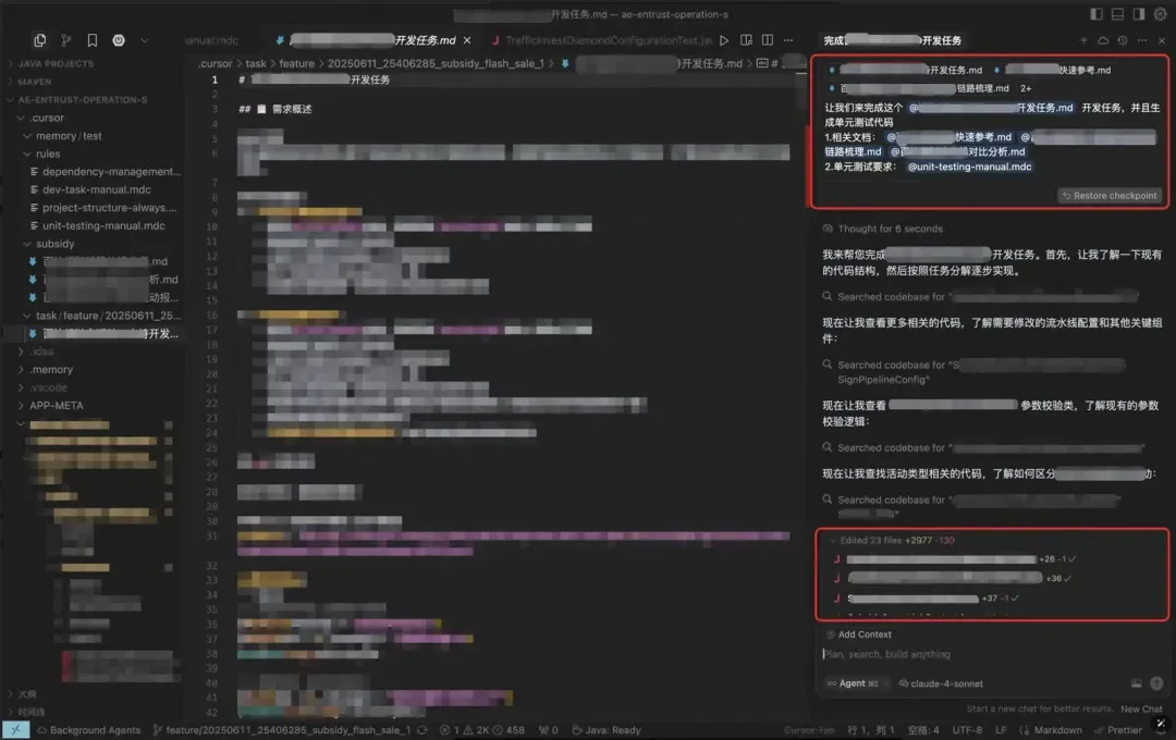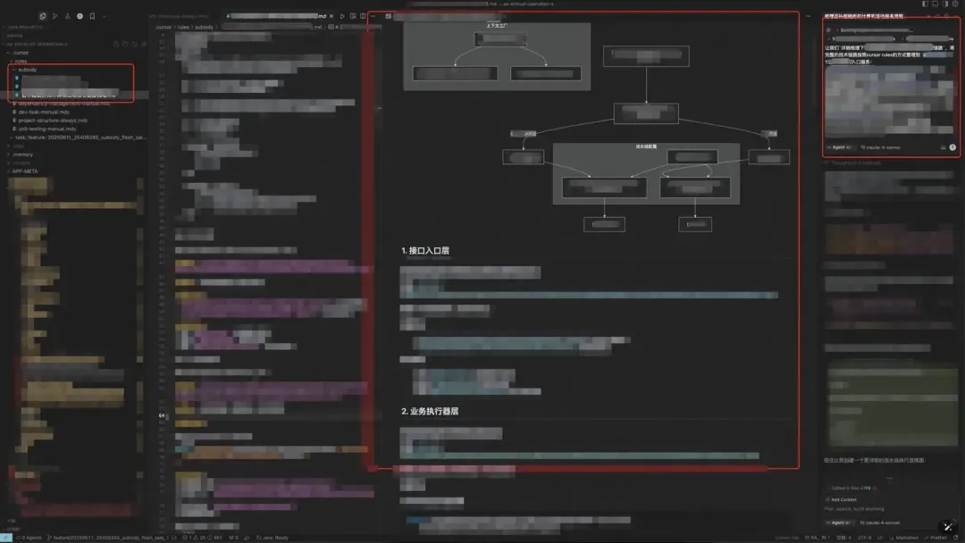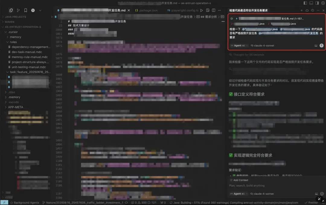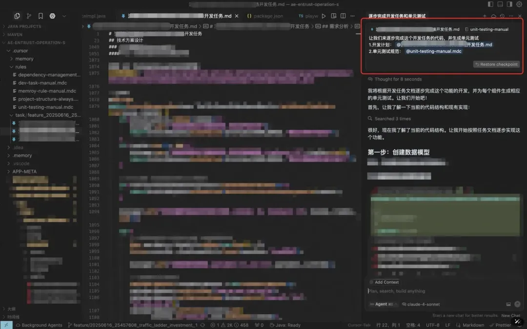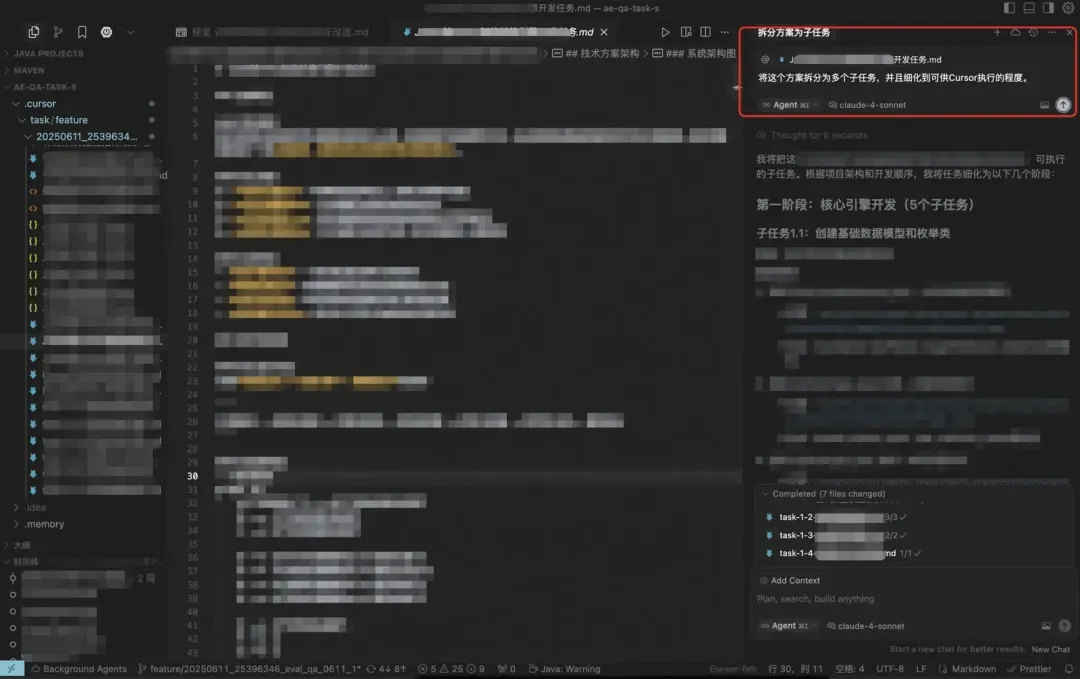- Cursor多子任务:将技术方案分成多个子任务后,可以在CursorIDE中同一个项目开启多个子任务并行开发,每个子任务分别验证。