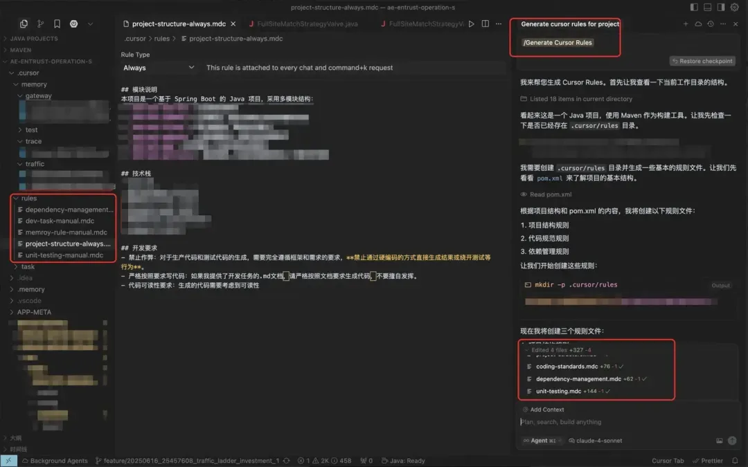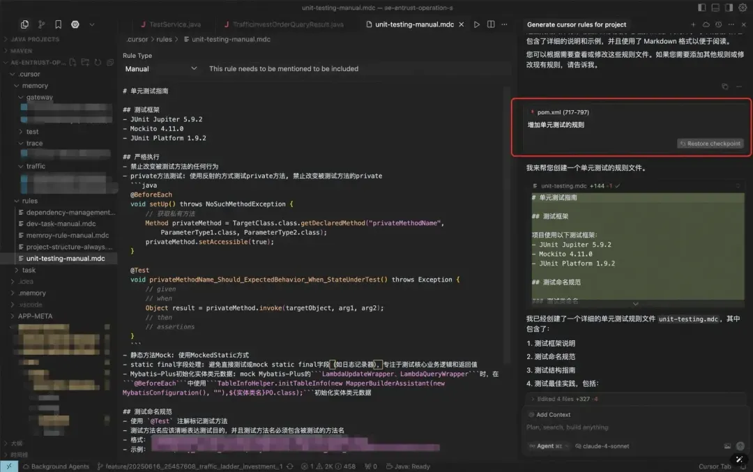 - 经验总结回写记忆:如果在开发过程中,发现有一些规范或场景在规则中没考虑到的,可以完成一个子任务后,要求AI总结经验,并且使用简洁的方式回写到对应记忆文档中。