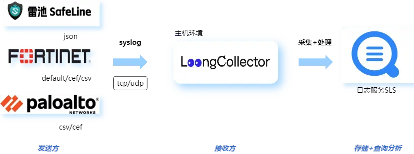 安全厂商防火墙日志可通过 Syslog 协议将日志转发到采集机器上,再通过 LoongCollector 采集、解析写入到阿里云的 SLS 日志库中。详细工作原理参见文档【6】。