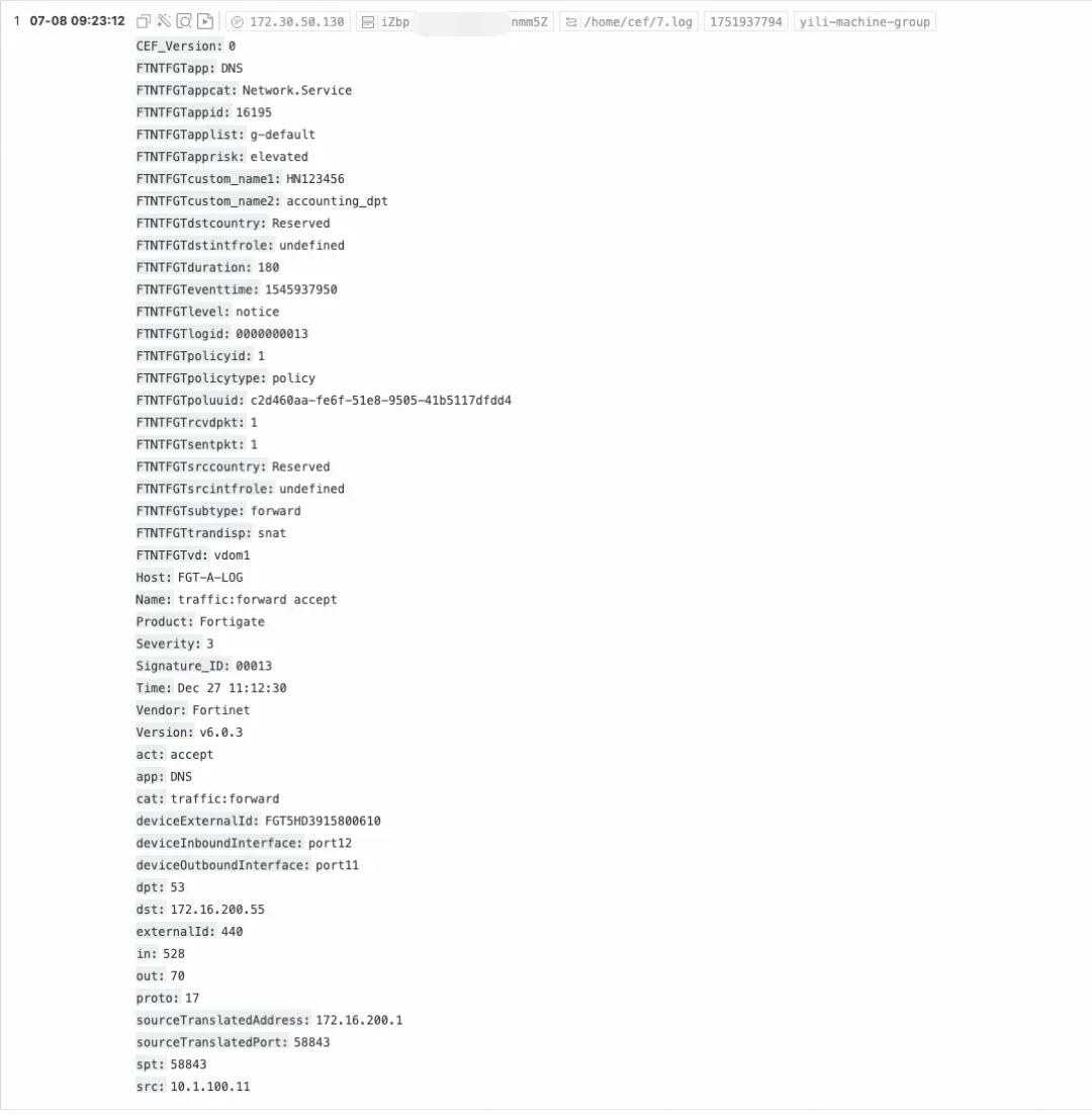 下面是飞塔 CEF 格式的流量日志示例,来源 Fortigate 官网【13】。