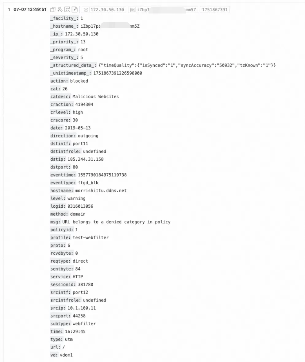 date=2019-05-13 time=16:29:45 logid="0316013056" type="utm" subtype="webfilter" eventtype="ftgd_blk" level="warning" vd="vdom1" eventtime=1557790184975119738 policyid=1 sessionid=381780 srcip=10.1.100.11 srcport=44258 srcintf="port12" srcintfrole="undefined" dstip=185.244.31.158 dstport=80 dstintf="port11" dstintfrole="undefined" proto=6 service="HTTP" hostname="morrishittu.ddns.net" profile="test-webfilter" action="blocked" reqtype="direct" url="/" sentbyte=84 rcvdbyte=0 direction="outgoing" msg="URL belongs to a denied category in policy" method="domain" cat=26 catdesc="Malicious Websites" crscore=30 craction=4194304 crlevel="high"