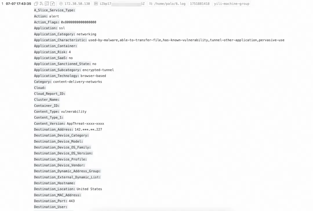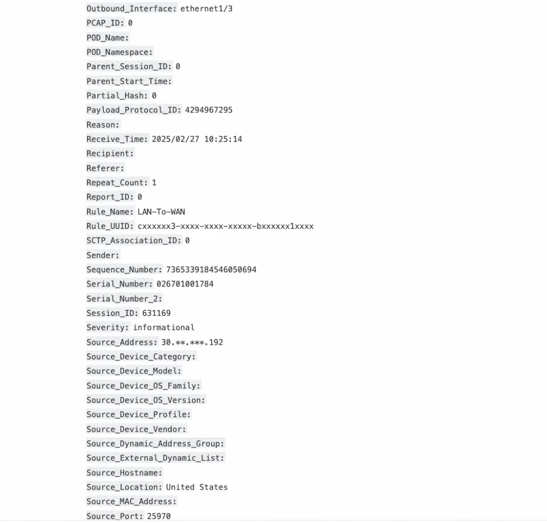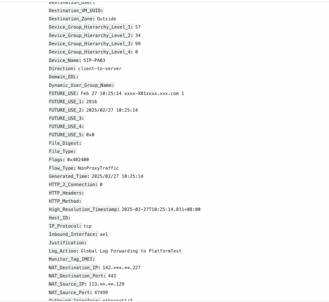 Feb 27 10:25:14 xxxx-X01xxxx.xxx.com 1,2025/02/27 10:25:14,026701001784,THREAT,vulnerability,2816,2025/02/27 10:25:14,30.**.***.192,142.***.**.227,113.**.**.129,142.***.**.227,LAN-To-WAN,,,ssl,vsys1,Inside,Outside,ae1,ethernet1/3,Global Log Forwarding to PlatformTest,2025/02/27 10:25:14,631169,1,25970,443,47499,443,0x402400,tcp,alert,"xxxxxx-xxx-xxxx-xx.xxxx.xxxxxx.com/",Non-RFC Compliant SSL Traffic on Port 443(56112),content-delivery-networks,informational,client-to-server,7365339184546050694,0x8000000000000000,United States,United States,,,0,,,0,,,,,,,,0,57,34,99,0,,SIP-PA03,,,,,0,,0,,N/A,protocol-anomaly,AppThreat-xxxx-xxxx,0x0,0,4294967295,,,cxxxxxx3-xxxx-xxxx-xxxxx-bxxxxxx1xxxx,0,,,,,,,,,,,,,,,,,,,,,,,,,,,,,0,2025-02-27T10:25:14.811+08:00,,,,encrypted-tunnel,networking,browser-based,4,"used-by-malware,able-to-transfer-file,has-known-vulnerability,tunnel-other-application,pervasive-use",,ssl,no,no,,,NonProxyTraffic