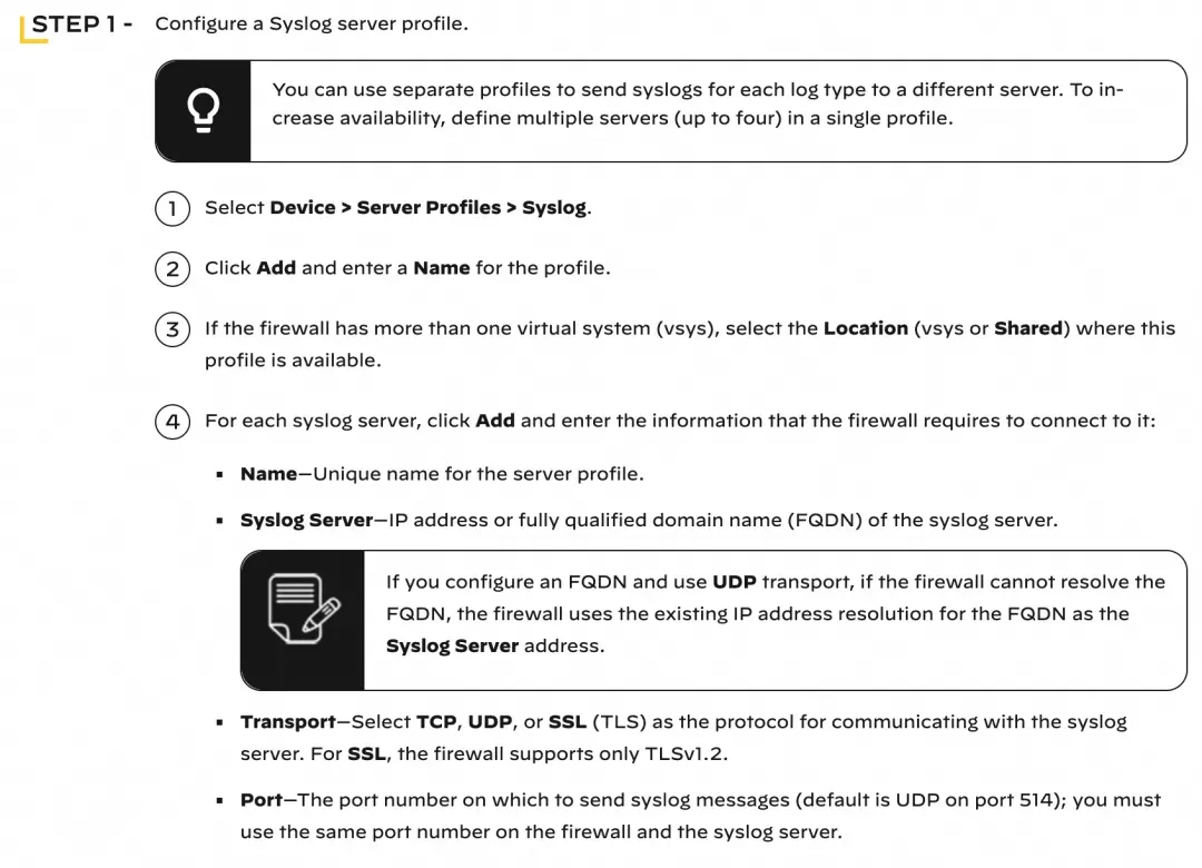 为了采集 Palo Alto NGFW 日志,我们首先创建一个 Syslog server 的配置(FQDN、端口、传输协议等),然后配置 Syslog 转发日志类型,证书等。详细配置可以参考 Palo Alto Networks 的防火墙文档配置【19】 。