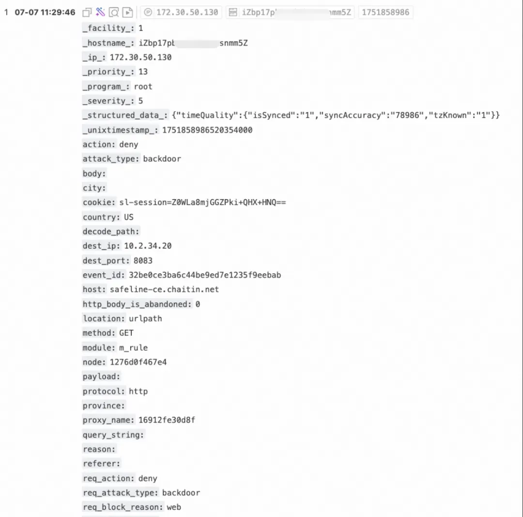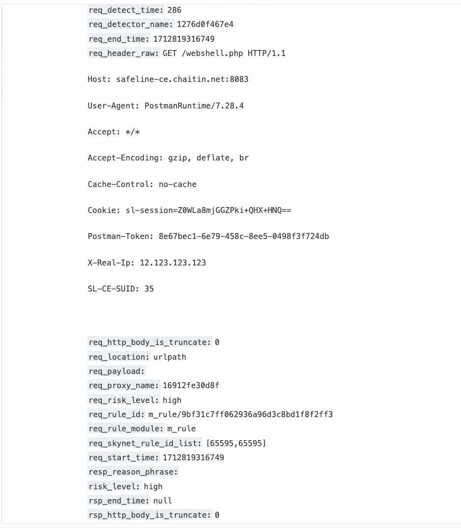 { "scheme": "http", // 请求协议为 HTTP "src_ip": "12.123.123.123", // 源 IP 地址 "src_port": 53008, // 源端口号 "socket_ip": "10.2.71.103", // Socket IP 地址 "upstream_addr": "10.2.34.20", // 上游地址 "req_start_time": 1712819316749, // 请求开始时间 "rsp_start_time": null, // 响应开始时间 "req_end_time": 1712819316749, // 请求结束时间 "rsp_end_time": null, // 响应结束时间 "host": "safeline-ce.chaitin.net",// 主机名 "method": "GET", // 请求方法为 GET "query_string": "", // 查询字符串 "event_id": "32be0ce3ba6c44be9ed7e1235f9eebab", // 事件 ID "session": "", // 会话 "site_uuid": "35", // 站点 UUID "site_url": "http://safeline-ce.chaitin.net:8083", // 站点 URL "req_detector_name": "1276d0f467e4", // 请求检测器名称 "req_detect_time": 286, // 请求检测时间 "req_proxy_name": "16912fe30d8f", // 请求代理名称 "req_rule_id": "m_rule/9bf31c7ff062936a96d3c8bd1f8f2ff3", // 请求规则 ID "req_location": "urlpath", // 请求位置为 URL 路径 "req_payload": "", // 请求负载为空 "req_decode_path": "", // 请求解码路径 "req_rule_module": "m_rule", // 请求规则模块为 m_rule "req_http_body_is_truncate": 0, // 请求 HTTP 主体 "rsp_http_body_is_truncate": 0, // 响应 HTTP 主体 "req_skynet_rule_id_list": [ // 请求 Skynet 规则 ID 列表 65595, 65595 ], "http_body_is_abandoned": 0, // HTTP 主体 "country": "US", // 国家 "province": "", // 省份 "city": "", // 城市 "timestamp": 1712819316, // 时间戳 "payload": "", "location": "urlpath", // 位置为 URL 路径 "rule_id": "m_rule/9bf31c7ff062936a96d3c8bd1f8f2ff3", // 规则 ID "decode_path": "", // 解码路径 "cookie": "sl-session=Z0WLa8mjGGZPki+QHX+HNQ==", // Cookie "user_agent": "PostmanRuntime/7.28.4", // 用户代理 "referer": "", // 引用页 "timestamp_human": "2024-04-11 15:08:36", // 时间戳 "resp_reason_phrase": "", // 响应 "module": "m_rule", // 模块为 m_rule "reason": "", // 原因 "proxy_name": "16912fe30d8f", // 代理名称 "node": "1276d0f467e4", // 节点 "dest_port": 8083, // 目标端口号 "dest_ip": "10.2.34.20", // 目标 IP 地址 "urlpath": "/webshell.php", // URL 路径 "protocol": "http", // 协议为 HTTP "attack_type": "backdoor", // 攻击类型 "risk_level": "high", // 风险级别 "action": "deny", // 动作 "req_header_raw": "GET /webshell.php HTTP/1.1\r\nHost: safeline-ce.chaitin.net:8083\r\nUser-Agent: PostmanRuntime/7.28.4\r\nAccept: */*\r\nAccept-Encoding: gzip, deflate, br\r\nCache-Control: no-cache\r\nCookie: sl-session=Z0WLa8mjGGZPki+QHX+HNQ==\r\nPostman-Token: 8e67bec1-6e79-458c-8ee5-0498f3f724db\r\nX-Real-Ip: 12.123.123.123\r\nSL-CE-SUID: 35\r\n\r\n", // 请求头原始内容 "body": "", // 主体 "req_block_reason": "web", // 请求阻止原因 "req_attack_type": "backdoor", // 请求攻击类型 "req_risk_level": "high", // 请求风险级别 "req_action": "deny" // 动作 }