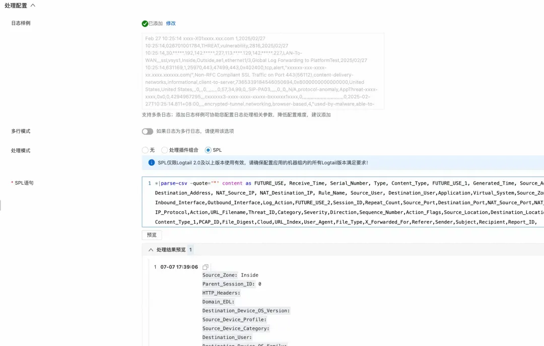 用户可配置本地服务器的 rsyslog 接收日志,并将 Palo Alto 日志存储到 /var/log/rsyslog/ 下的日志文件中。然后配置 LoongCollector 文件采集方式采集日志, 通过 SPL【21】 语句的 parse-csv 指令【22】处理日志【23】字段。