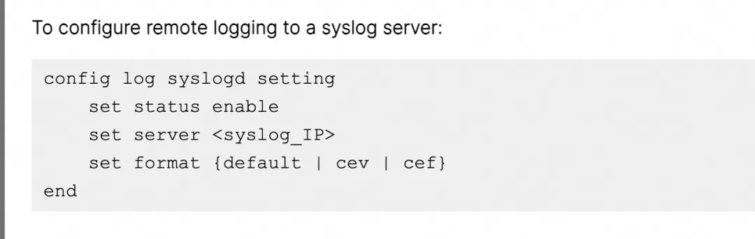 可以参考文档【14】进行 FortiGate 日志配置 Syslog 转发,除默认格式外,还支持转发 CEF 格式和 CSV 格式。